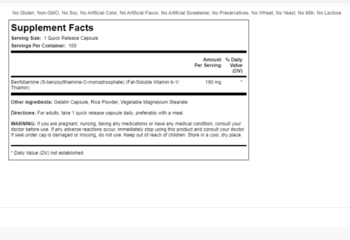 Benfotiamine 160mg with Vitamin B-1/Thiamin High Potency 5X100 Caps Non-GMO/No Gluten