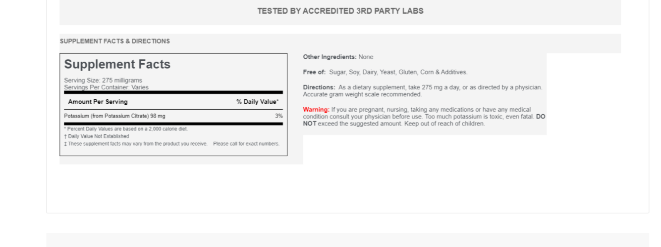 Potassium citrate is a safe and bioavailable source of potassium, combined as an ionic salt with citric acid Both potassium and citric acid play important roles in human metabolism. Potassium is essential for proper muscle function, energy metabolism, neurological functions and as an electrolyte. Citric acid is a component of the Citric Acid Cycle, an energetic process that takes place in mitochondria and produces two thirds of the food-derived energy in higher organisms.TESTED BY ACCREDITED 3RD PARTY LABS