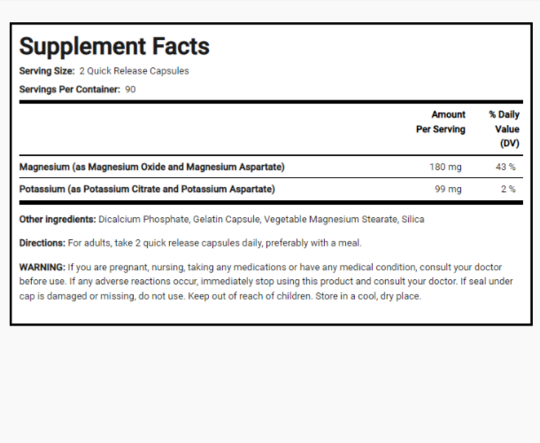 | Magnesium (from magnesium aspartate and magnesium oxide) | 180 mg | 45% |